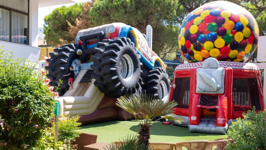 Un albergo per famiglie in grado di garantire il 100% di divertimento ai bambini e ai ragazzi! All’aperto gli spazi dedicati al gioco sono davvero grandi e ben attrezzati, ma sicuramente quello che proprio non può mancare, per la felicità dei bambini, sono i giochi gonfiabili. Siamo l’unico hotel con 3 mega gonfiabili a Milano Marittima, un’area tanto grande e amata che le abbiamo dato anche un nome: Gommoland.